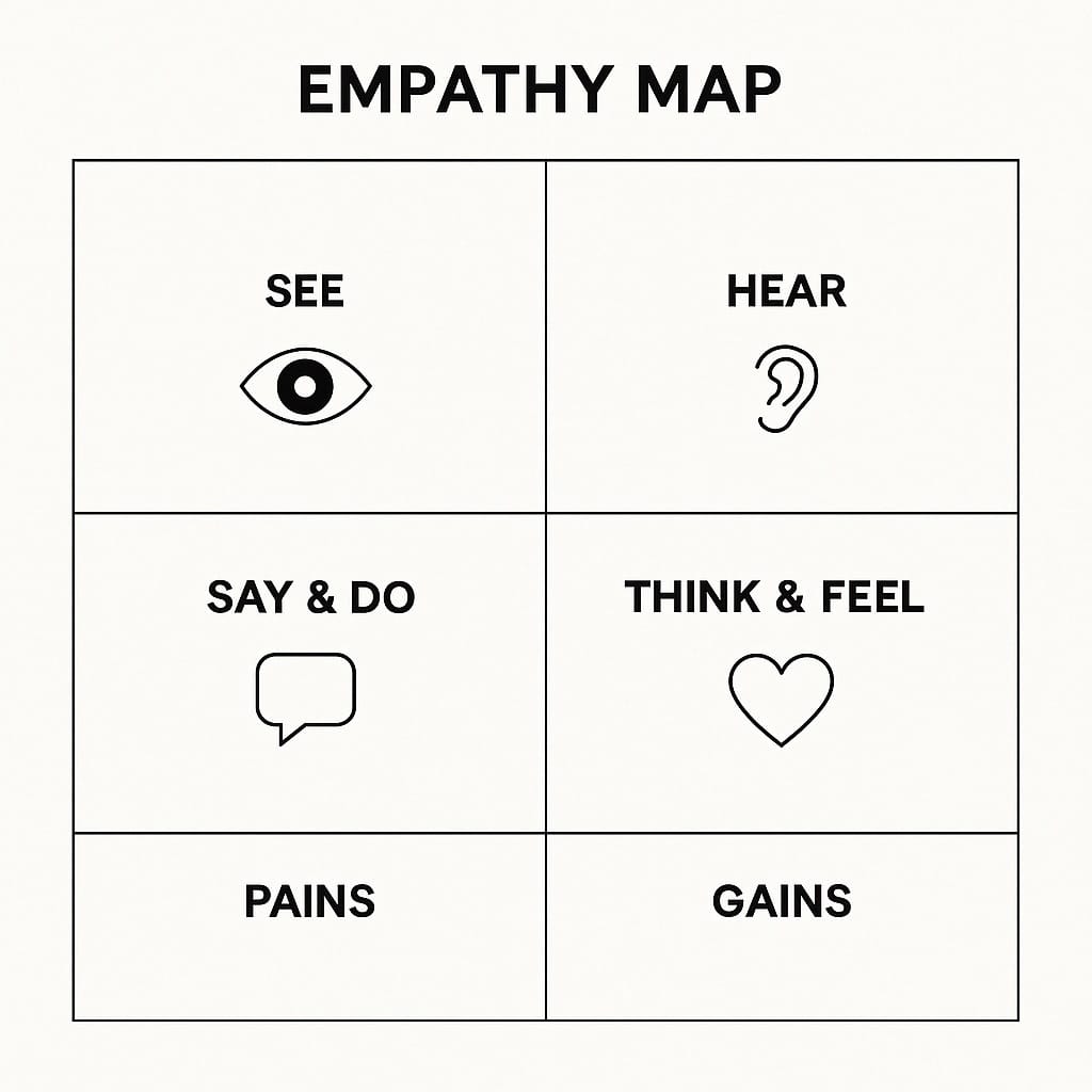 同理心地图(Empathy Map) 是一种设计思维中的调研工具,旨在帮助团队深入理解用户的情感、行为、想法与体验环境。